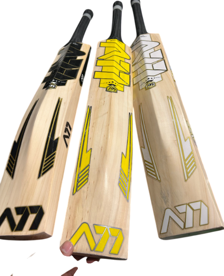 The A77 bat, often crafted from fine wood like English Willow or high-grade Kashmir Willow, is a cricket bat designed for playing with a leather ball in competitive or serious practice matches. It aims to offer a good balance of power, pick-up, and durability within its specific price range or grade.