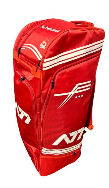 The A77 Professional with Tractor Wheel is a large, horizontal trolley-style kitbag. Its design philosophy centers on hassle-free mobility for a comprehensive cricket kit. The hallmark of the bag is its robust undercarriage, featuring the prominent "Tractor Wheels"—large, sturdy wheels mounted on a structural base frame. This setup allows the bag to maintain momentum and balance, even when traversing uneven surfaces where smaller wheels would fail.